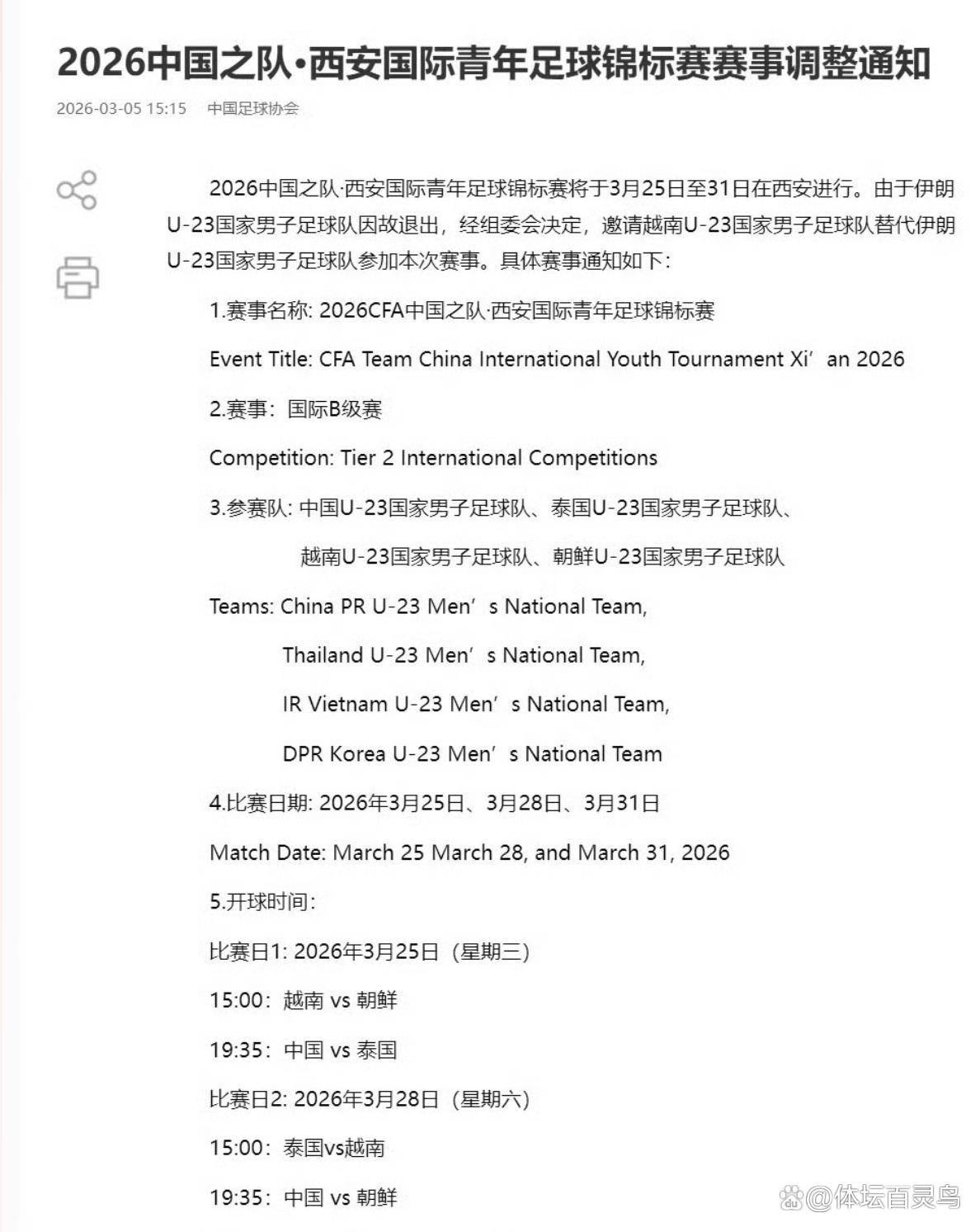 就在伊朗女足在黄金海岸为尊严而战的同时,伊朗足球的另一个坏消息从中国传来。 3月5日,中国足球协会官方发布通知,原定于3月25日至31日在西安举行的“2026中国之队·西安国际青年足球锦标赛”,伊朗U-23国家男子足球队因故退出。
