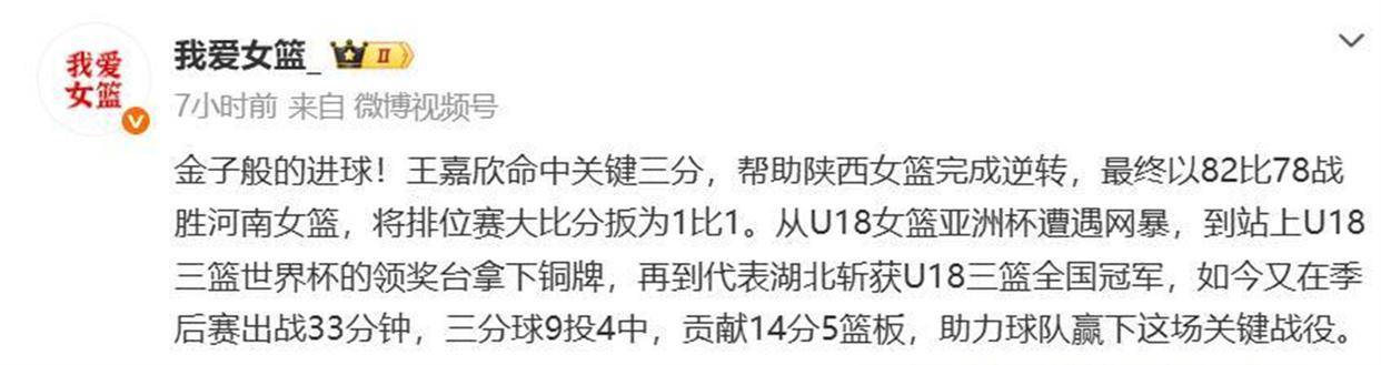 正是带着这样的过往,再看2026年4月1日晚上的这场WCBA季后赛,意义便格外不同。 这不仅仅是一场将总比分扳成1比1的胜利,更像是一次个人的正名与突破。 在球队命悬一线的绝境中,在需要英雄站出来的时刻,这个曾经被口水淹没的年轻人,用她最擅长的投篮,投进了或许能改变许多人看法的一球。 从U18亚青赛决赛后的全网质疑,到WCBA季后赛的关键先生,王嘉欣走过的这条路,充满了成长的荆棘与救赎的意味。