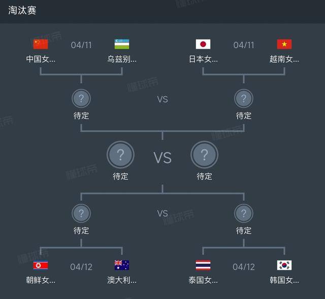 淘汰赛形势如下图,在日本女足率先晋级四强后,今日21:00点,中国女足将对阵乌兹别克斯坦,决出第二个四强名额,并将与日本女足在半决赛相遇。
