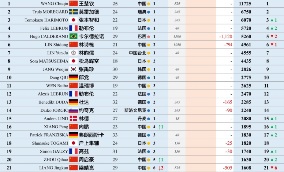本期排名中最令人关注的变化来自国乒名将梁靖崑。他的世界排名从第15位骤降至第21位,跌出前20行列。这一下滑主要源于去年澳门世界杯男单四强的525分积分到期。