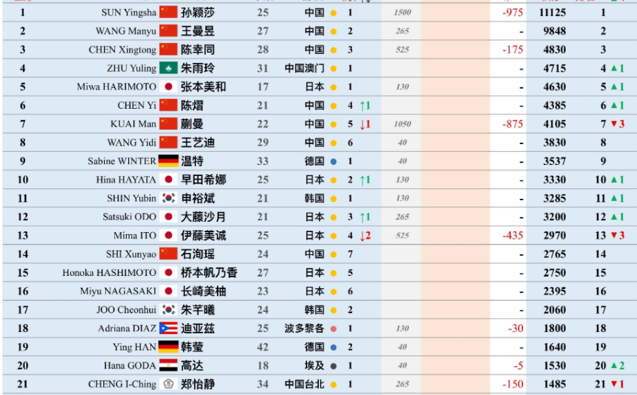 女单前十中,代表中国澳门出战的朱雨玲位列第四,日本一姐张本美和升至第五,王艺迪、温特和早田希娜分别是第八、第九和第十。