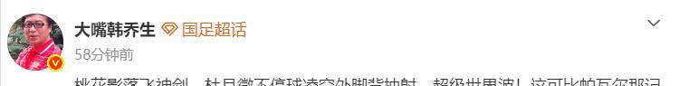 杜月徵的这粒非凡进球引发热议,著名体育评论员韩乔生更是称赞其“不停球凌空外脚背劲射”的技艺堪比乃至胜过帕瓦尔的经典凌空抽射,将这一进球形容为“桃花影落飞神剑”,体现了美妙的艺术美感。