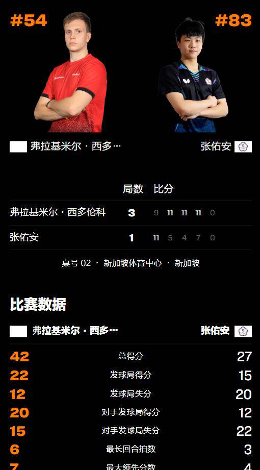 比赛方面,首局张佑安发挥稳定,双方你来我往的拉锯战中,他始终保持微弱领先,并以11-9先下一城。可惜从第二局开始,希德仁科逐渐掌控了节奏,中段迅速拉开分差,以11-5扳回一局。第三局张佑安状态明显下滑,仅获得4分便被对手迅速拉开比分。随后,他虽一度尝试追分,但希德仁科多次三板抢攻成功,最终以11-6锁定胜局。此役希德仁科凭借稳健的前三板技术和快速积极的攻击风格占据上风,而张佑安虽然勇于拼搏,但在三板环节欠缺优势,单板质量在遇到力量型欧洲选手时暴露短板,最终遗憾败北亦情有可原。