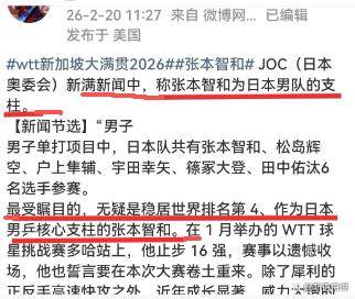 2026年2月20日,距离新加坡大满贯正赛开打还有两天,日本奥委会通过“新满新闻”发布了一篇战前动员。 文章里白纸黑字地把张本智和称为“日本男乒的核心支柱”,并断言他将成为“对决中国选手的最大武器”。 日本队这次派出了六名男单选手,张本智和的名字排在第一位。
