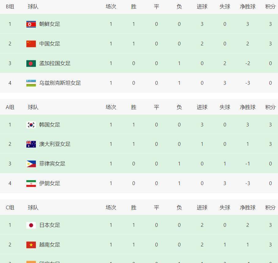 根据现有积分情况,A组暂列第一的是韩国女足,这意味着首轮战罢,三个小组的领头羊分别是日本队、朝鲜队和韩国队,亚洲女足的传统强队依旧保持着强大的竞争力。
