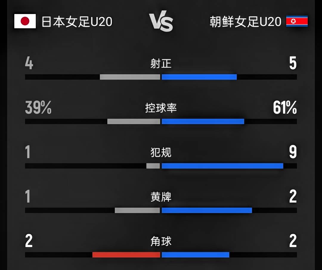 而本场比赛中,朝鲜队整体上也是略占优势的,在控球率和射正数方面也领先对手,但日本U20女足的整体防线较为稳固,并没有给朝鲜队太多得分机会,而自身则凭借着一次前场定位球机会,取得了比分的领先。