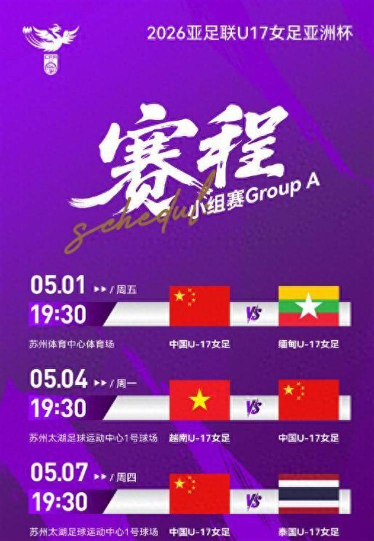 作为东道主,中国U17女足国家队被分在了A组。 同组的三个对手分别是泰国队、越南队和缅甸队。 中国队的具体小组赛日程安排已经确定。 第一场比赛是在5月1日晚上19点30分,这也是整个亚洲杯的揭幕战,由中国队对阵缅甸队,比赛场地设在苏州体育中心体育场。