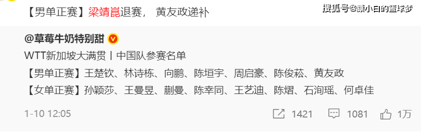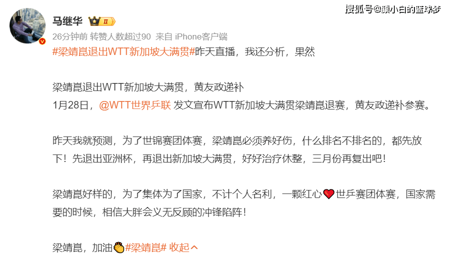 马继华写道:我昨天就预测过,为了世乒赛团体赛梁靖崑必须养好伤,什么世界排名都不重要,先退亚洲杯再退新加坡大满贯,好好治疗休整,三月份再复出吧。