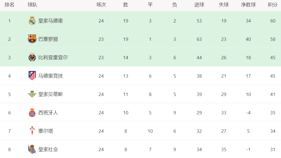 在积分榜的争夺方面,皇家马德里以60分的优异成绩,稳居榜首。他们本赛季至今的战绩是19胜3平2负,表现堪称统治级。紧随其后的是积58分的巴塞罗那,位居第二。不过,巴萨比皇马少赛一轮,他们仍有机会在接下来的比赛中重返榜首。比利亚雷亚尔以45分暂居第三。而马德里竞技在本轮惨败之后,虽然积分依旧是45分,但由于净胜球不及比利亚雷亚尔,因此跌至第四名的位置。皇家贝蒂斯在赢球之后,总积分达到了41分,继续缩小着与身前球队的差距,排名第五,距离欧冠区域的争夺越来越近。西班牙人则以35分位列第六。