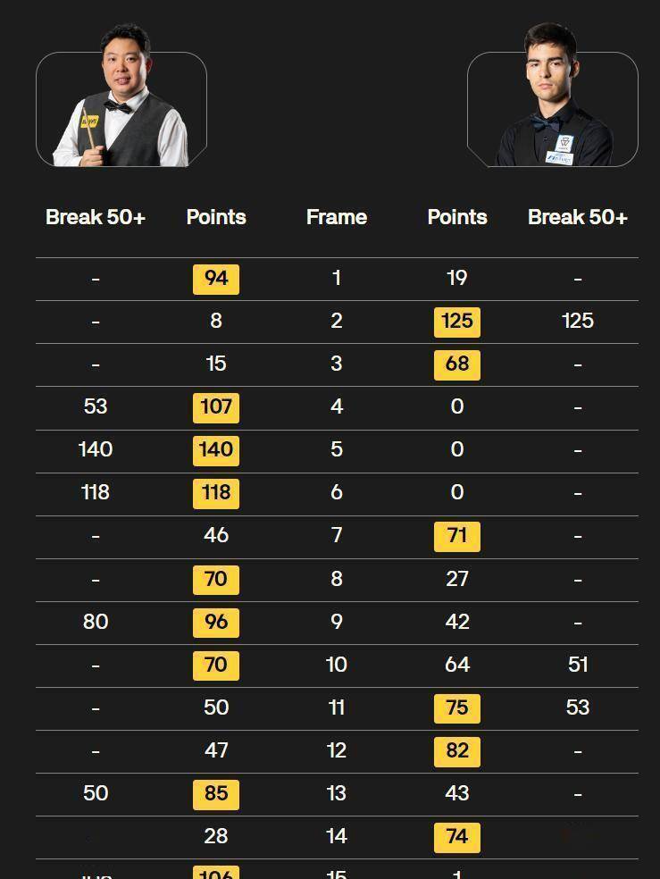 中场休息回来后,雷佩凡彻底接管了比赛。 他连续打出单杆110分、58分和62分,一口气连赢四局,将领先优势扩大到6-2。 第九局,布朗打出一杆66分,以108-0零封雷佩凡,将比分追至3-6。 比赛进入第二阶段,雷佩凡的状态依然火热。 第十局,他回敬了一杆119分的破百。 第十一局,雷佩凡本已打出单杆53分领先,但被布朗用一杆65分实现单局逆转。不过,这并没有影响雷佩凡的节奏。第十二局,他打出单杆63分,以79-40获胜。 第十三局,他又是一杆60分,以65-21拿下,以9-4拿到赛点。 第十四局,双方都有上手机会,最终雷佩凡以80-57锁定胜局,总比分10-4晋级。 全场比赛,雷佩凡贡献了两杆破百和六杆50+,进攻火力十分凶猛。