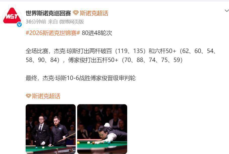 中国香港名将傅家俊本轮遭遇强敌,世界排名第19位的威尔士选手杰克·琼斯。 琼斯是上届世锦赛亚军,状态正佳。比赛开始后,琼斯迅速进入状态,首局打出一杆62分先拔头筹。傅家俊在第二局以单杆70分还以颜色。 随后双方交替得分,第一阶段九局战罢,琼斯以5-4领先。 第二阶段,琼斯的进攻火力更加凶猛。 他先后打出了单杆119分和135分两杆破百,此外还有多杆50+的表现。 傅家俊虽然也打出了五杆50+,包括单杆88分和75分,但在对手持续的高压进攻下,始终难以扭转局面。 最终,杰克·琼斯以10-6的比分战胜傅家俊,晋级审判轮。傅家俊则遗憾地结束了本赛季的世锦赛征程。