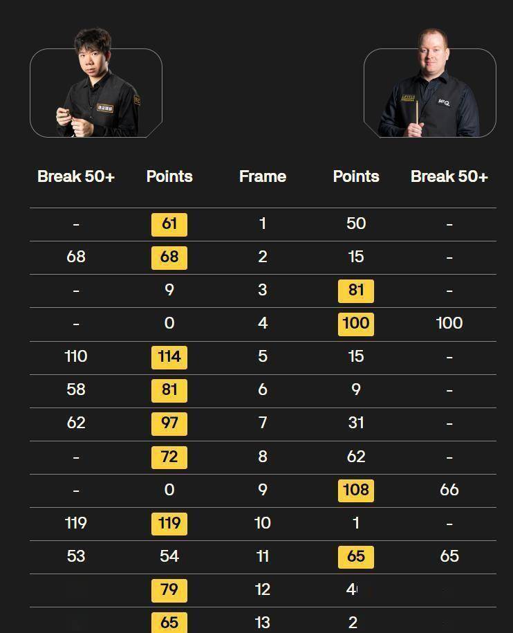 一场中国德比在徐思和刘宏宇之间上演。 两人世界排名接近,此前从未交手。 比赛过程正如人们预料的那样激烈。 整场比赛双方七次打平,比分始终没有被拉开。 第一阶段九局比赛结束后,徐思以5-4的微弱优势领先。 进入第二阶段,战况依旧焦灼。 第十局,刘宏宇以85-39获胜,将比分扳成5-5平。 第十一局,徐思打出单杆74分拿下。 第十二局,刘宏宇回敬一杆58分,再次追平比分至6-6。 第十三局,徐思以66-45取胜,再次领先。 第十四局,徐思打出单杆107分,连赢两局后以8-6占据优势。 第十五局,刘宏宇轰出单杆64分,以111-0扳回一局。 第十六局,刘宏宇再打一杆51分,以85-8获胜,顽强地将总比分追成8-8平。 比赛被拖入决胜时刻。 第十七局,徐思顶住压力,打出一杆100分的破百,以9-8率先拿到赛点。 第十八局,徐思没有再浪费机会,最终以10-8的比分赢得了这场艰苦的内战,成功晋级。 技术统计显示,徐思全场有两杆破百和四杆50+,刘宏宇也有四杆50+的表现。