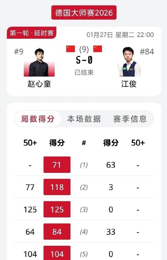 第二局,赵心童开始找到进攻手感,他打出单杆77分,77-0零封对手,2-0领先。第三局,赵心童进一步提升进攻手感,他轰出单杆125分,比分优势扩大到3-0。
