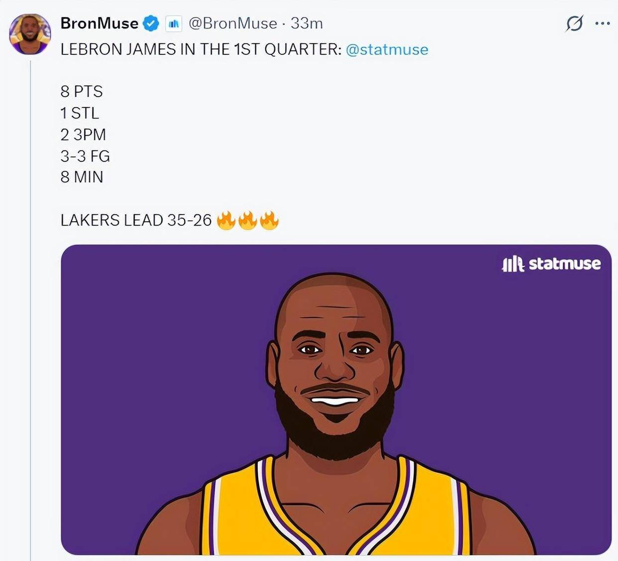 比赛从一开始就定下了基调。 首节打了8分钟,詹姆斯3次出手全部命中,其中包括两记三分球,单节拿下8分1抢断。 要知道,他本赛季的三分命中率长期在31%左右徘徊,这一晚的手感热得发烫。